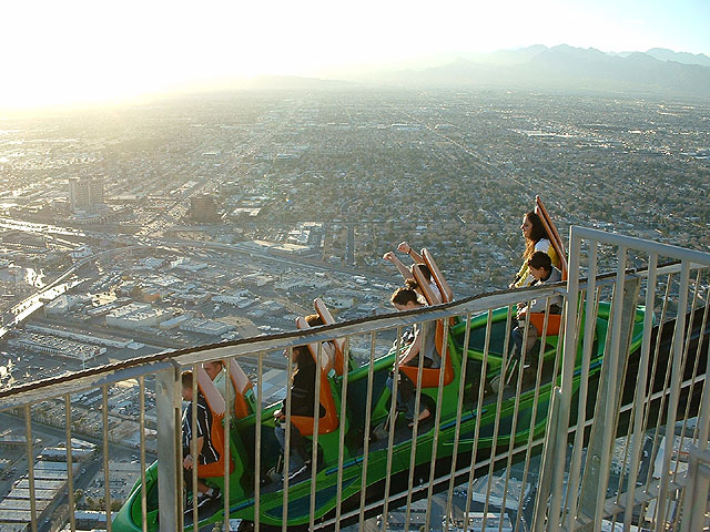 Der " X Scream" läßt die Fahrgäste in 270 Metern Höhe über dem Rand des Turms hängen