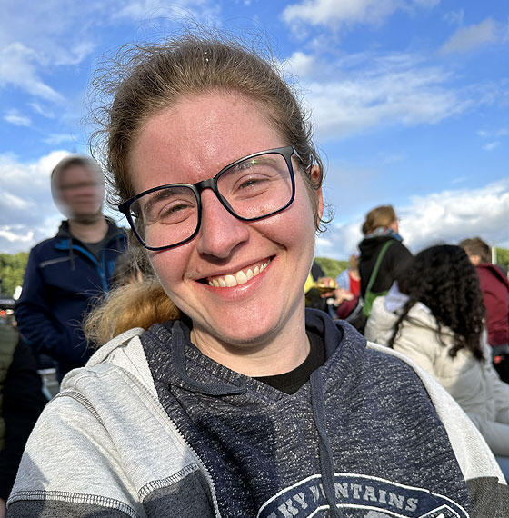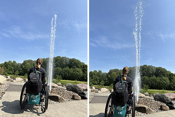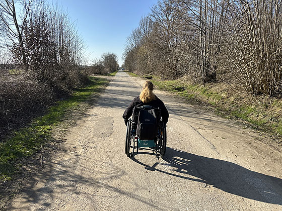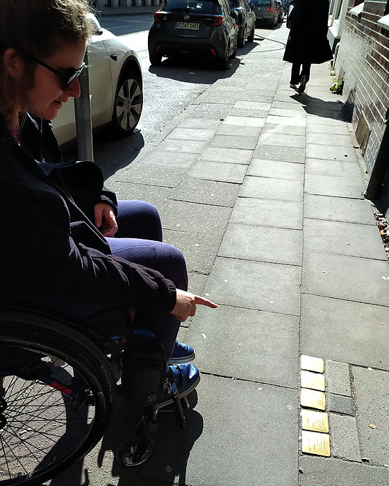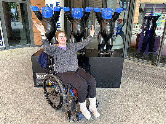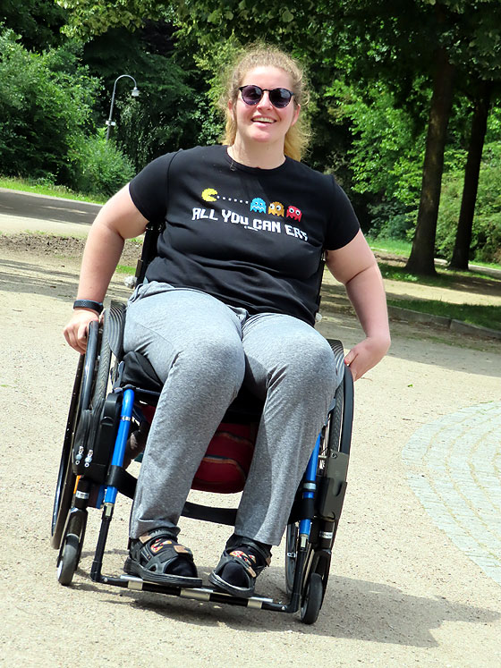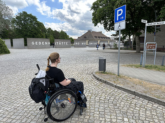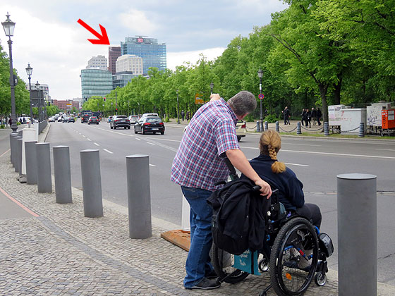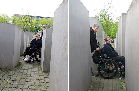 So z.B. das Holocaustdenkmal, durch dessen Stelen wir dann jetzt schon zweimal durchgerollert sind: einmal im September 2022 („Seeed!!!“) mit dem alten, großen Rollstuhl namens „Kackfass“ und diesmal mit ihrer „Cloudy Blue“: