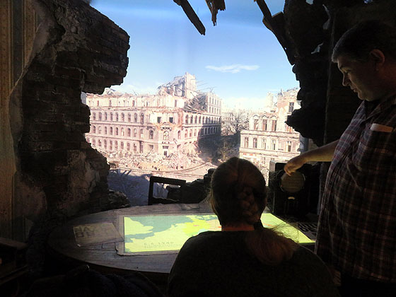Es folgte der Kulturprogrammpunkt Nr. 1: das Deutschlandmuseum, wo man von Raum zu Raum eine Zeitreise unseres Landes erleben kann – angefangen bei den Römern und Germanen (dieser Raum ist wie ein (Ur-)Wald gestaltet), durch die diversen Perioden des Mittelalters, über die Reformation und Aufklärung, natürlich den I. Weltkrieg (Raum = Schützengraben), den II. Weltkrieg (Foto zeigt die Sicht aus einer Ruine auf das zerstörte Berlin) und diverse Wohnungseinrichtungen bzw. Erinnerungsstücke von den 50ern bis zur Jahrtausendwende.