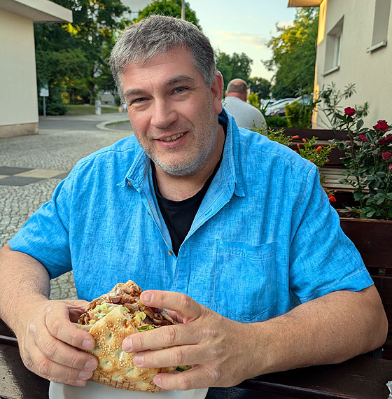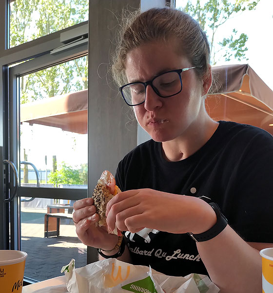Apropos Fortschritte – ich weiß, Stephanie wird dieses Foto hassen („Sorry Kind!“). Doch was genau sehen wir hier? Sie hält mit beiden (!) Händen einen Burger und isst diesen ganz selbstständig, ohne dass am Ende das ganze Patty herausquillt. Manchmal müssen wir ihr zwar helfen, da sie die Gesamtsituation noch nicht so im Blick hat, aber mehr als nur Anfänge sind schon mal da … weiter so!!!