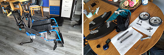 Für dieses Ziel hat Carsten den Rollstuhl zwischenzeitlich einmal größtenteils auseinandergenommen, um ihn zu reinigen, zu ölen, zu fetten und die Schrauben bzw. Muttern wieder einmal richtig anzuziehen: