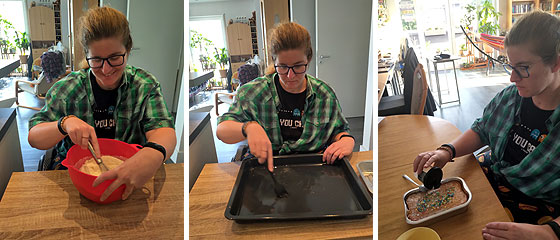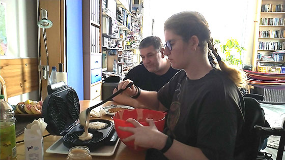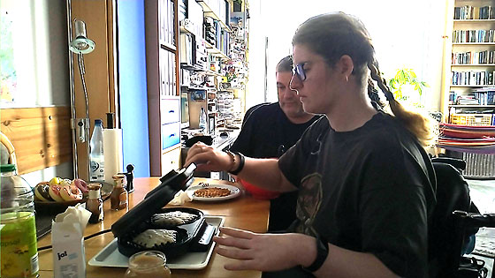 Mit dabei war auch ein Waffeleisen, welches wir dann gleich an einem der nächsten Tage ausprobiert haben. Stephanie war dabei an allen Schritten beteiligt und durfte größtenteils sogar selbst Hand anlegen: beim Teig machen, beim Einfüllen …