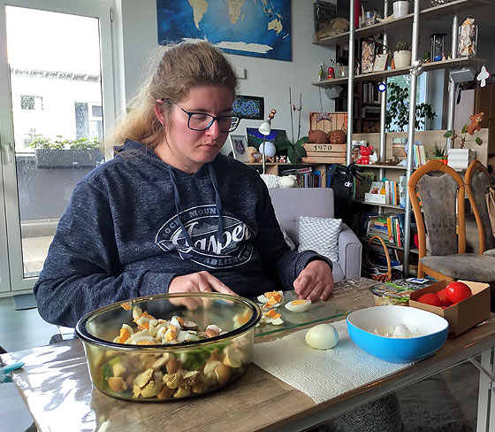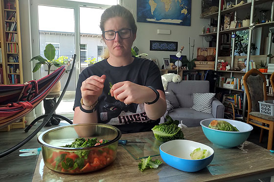 Einen leckeren Salat zusammenzuschnibbeln macht sie ja schon seit Monaten (ich kümmere mich eigentlich fast nur noch ums Dressing) und mittlerweile ist sie darin aber auch schon richtig fix geworden: