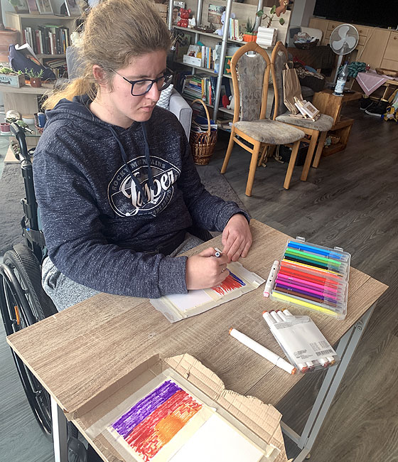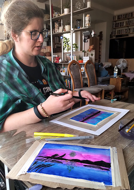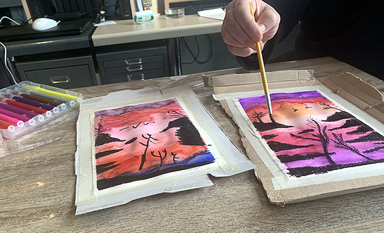 Den Anfang machten wir mit Filzstiften, die in Verbindung mit aufgepinseltem Wasser zu einer Art Aquarellbilder werden: