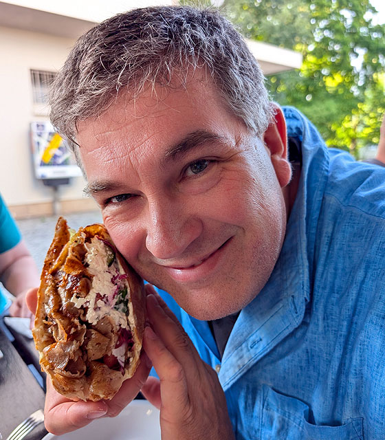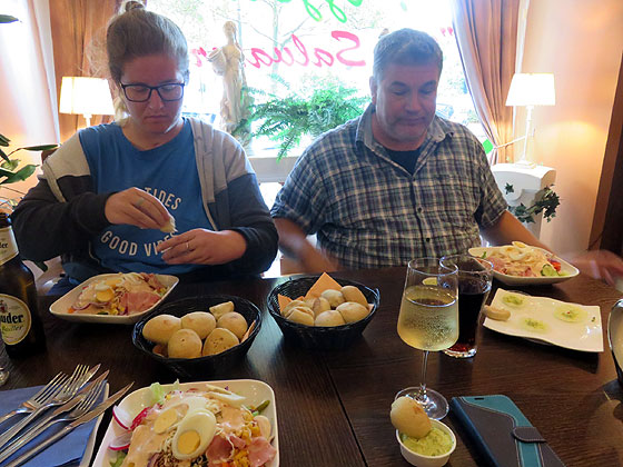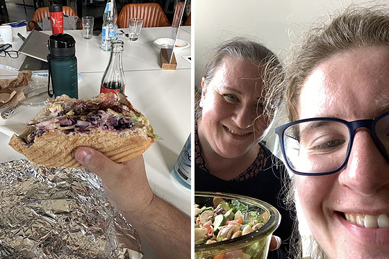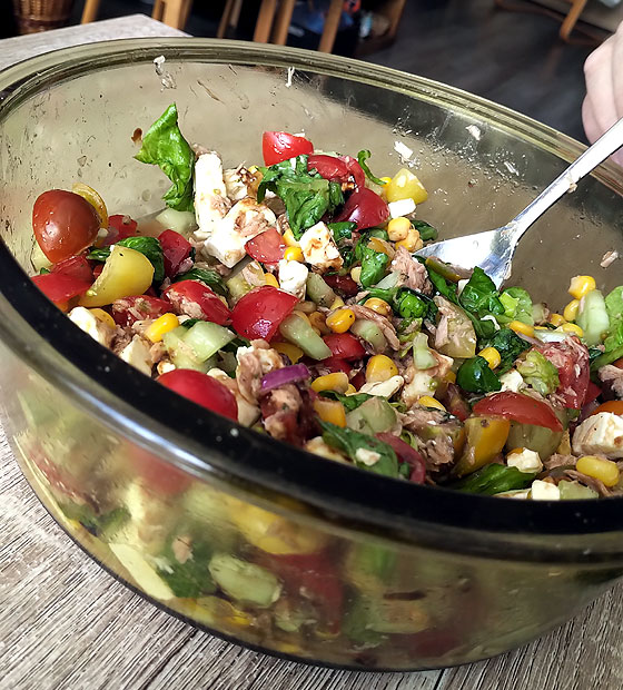 Carsten konnte uns selbst mit seinem Dönerfoto (links) nicht beeindrucken, denn wir hatten einen selbstgemachten Salat (rechts) mit viiiiiiiiiiel Mais gezaubert!!!