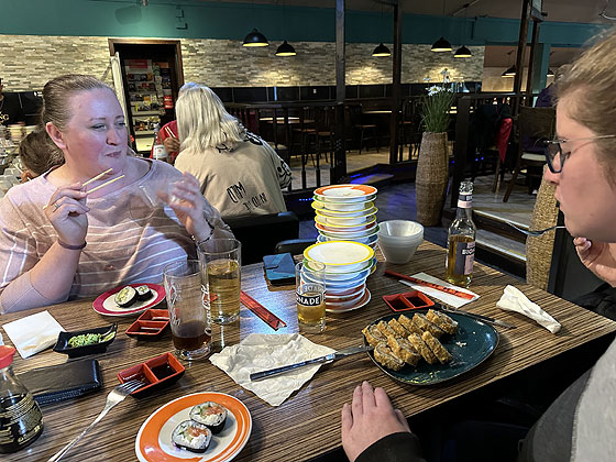 Erneuter Sprung zur Kultur: das nächste Bühnenprogramm besuchten wir am 14.6. (Freitag – zeitgleich mit dem EM-Eröffnungsspiel der Deutschen Nationalmannschaft gegen Schottland) wieder zu dritt. Vorab aber schnell noch das Wochenende gebührend beim Running-Sushi einläuten, …
