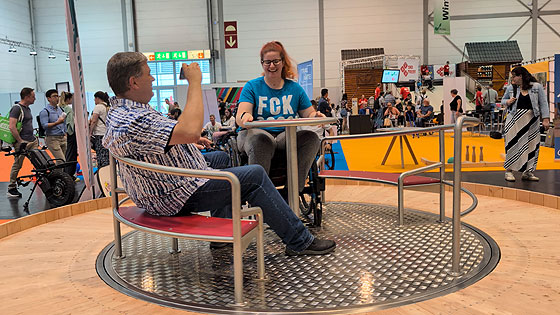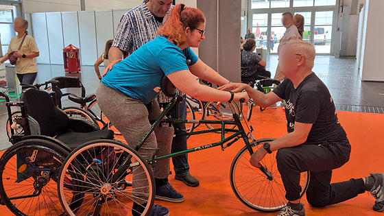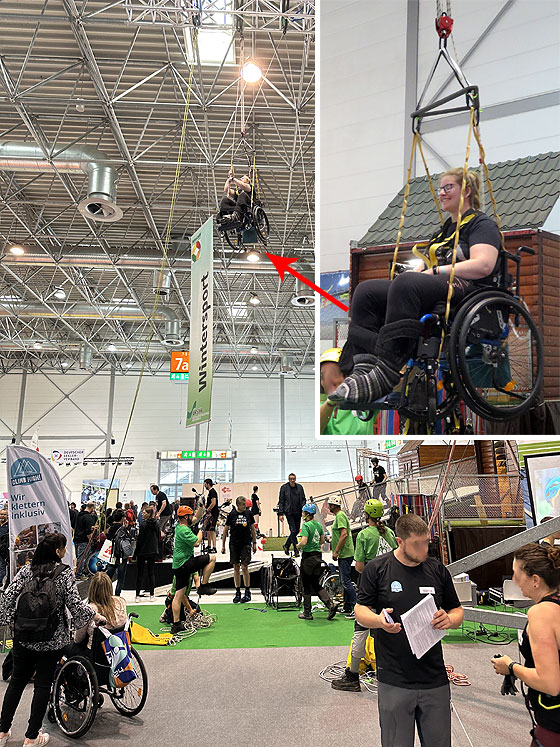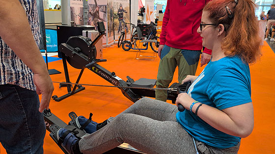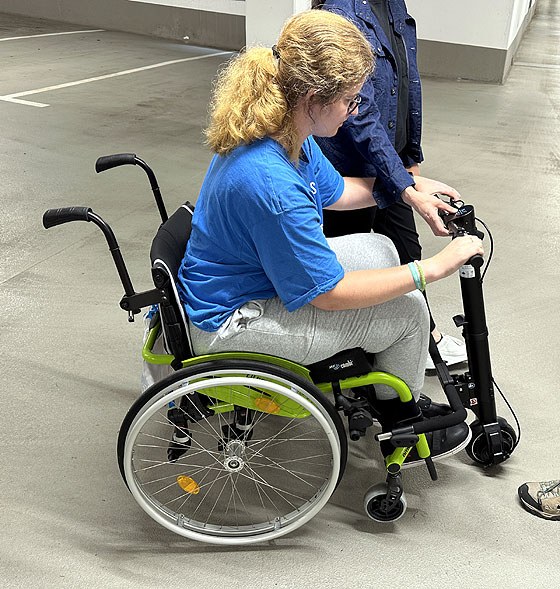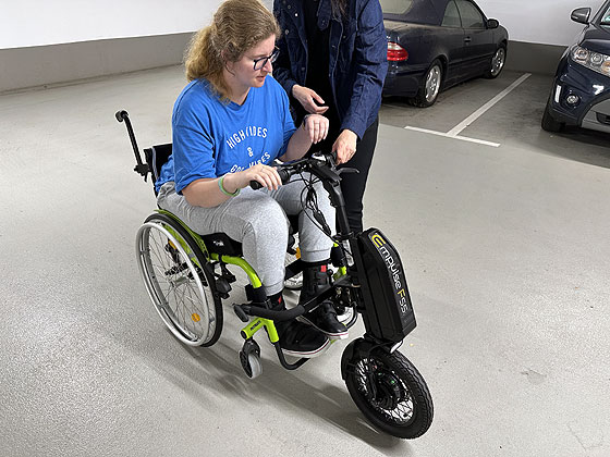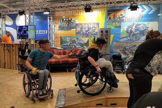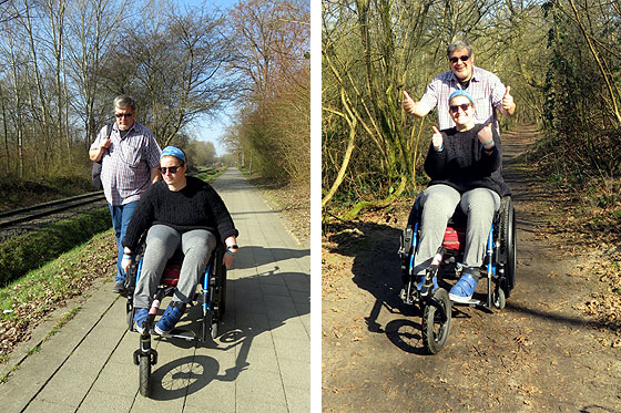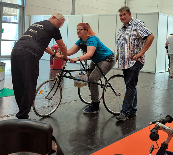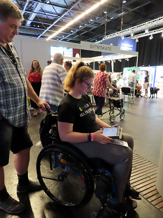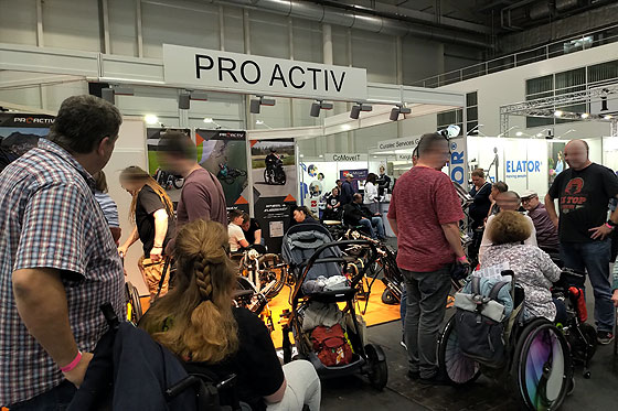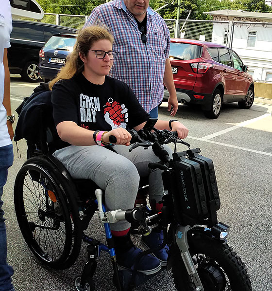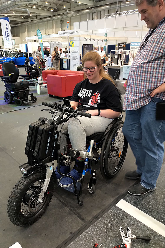 … sondern auch gleich mal nach etwas Neuem Ausschau halten. Neben barrierearmen und -freien Ausflugszielen, Pflegeassistenz, Rollizubehör und Wohnmöglichkeiten interessierten wir uns diesmal ganz besonders für ein Zugrad für Stephanie. Auf einer solchen Messe hat man ja immer mal wieder die Möglichkeit, so etwas gleich vor Ort ausprobieren zu können – ist dann auch bei „Rehasense“ geschehen, die so etwas PAWS (Power Assisted Wheelchair Systems) nennen und zudem eine total universelle Anklipp-Anhängung im Portfolio haben. Der nette Herr vor Ort baute dieses Zugrad trotz fehlender Teile in 30 min so an Stephanies Rolli an, …