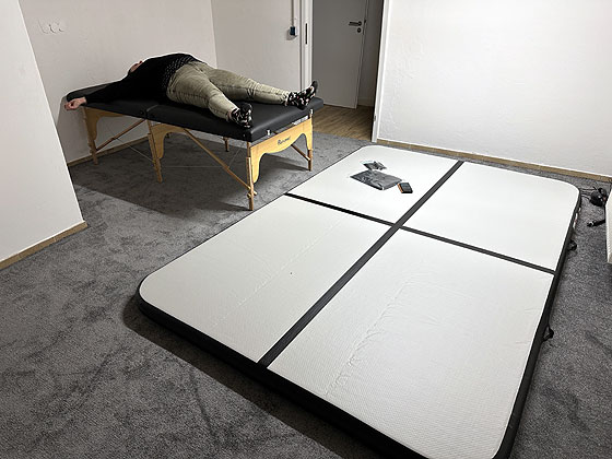 Mit einer Ablenkung – hier z.B. das Trinken aus einer Flasche – versuchen wir, sie noch zusätzlich während des Freistehens abzulenken, um so ihre Gedanken immer mehr von der Beibehaltung des Gleichgewichtes abzuziehen. Schließlich soll das irgendwann einmal ja auch automatisch vom Körper, also unterbewusst und nicht mit Hochkonzentration, koordiniert werden. Leider stellt sich der linke Fuß noch nicht mit vollem Gewicht auf den Boden oder ist am Ende viel zu eingeknickt, wie man auf dem letzten Foto ganz gut sehen kann … denn wie gut und lange man auf einem Bein stehen kann, weiß ja jeder von uns selbst: