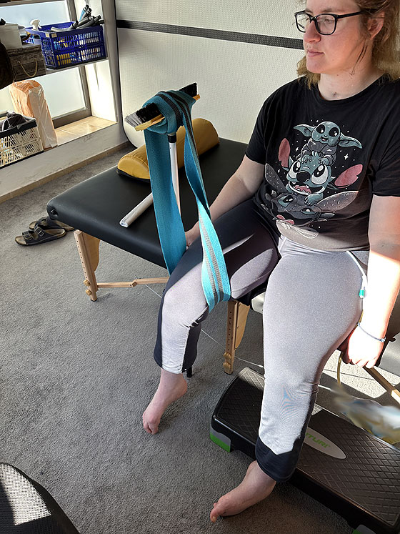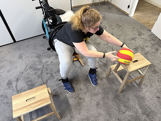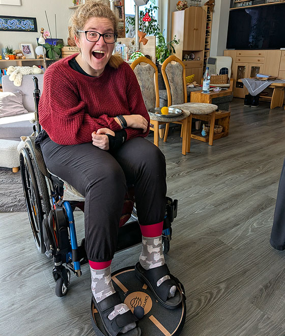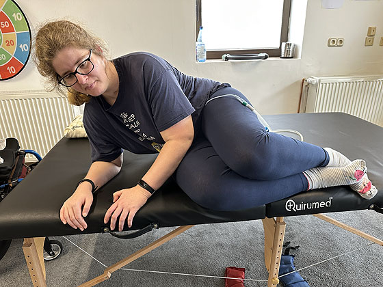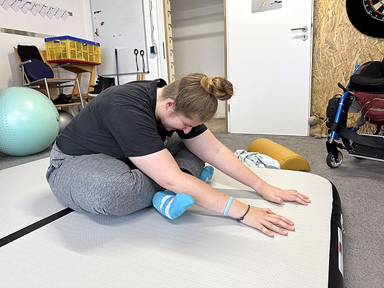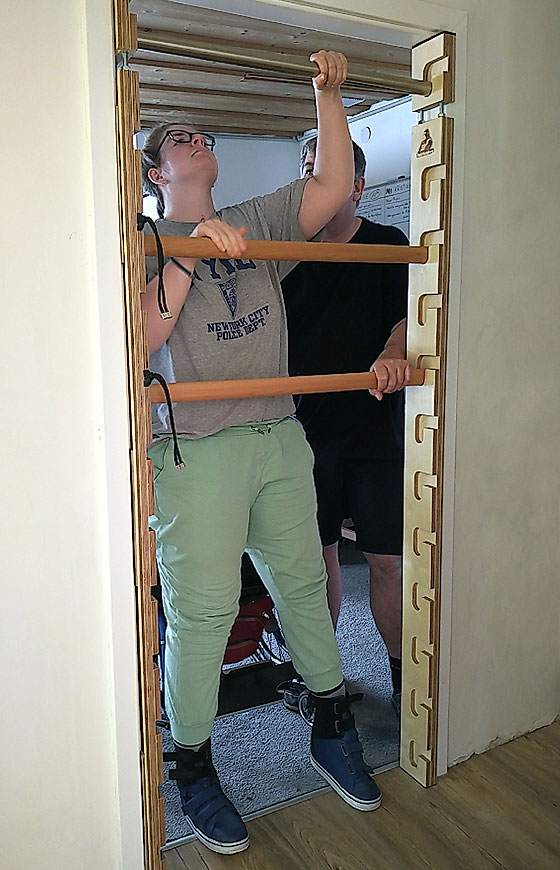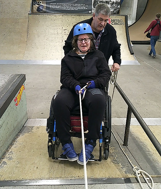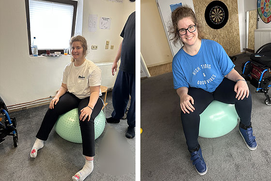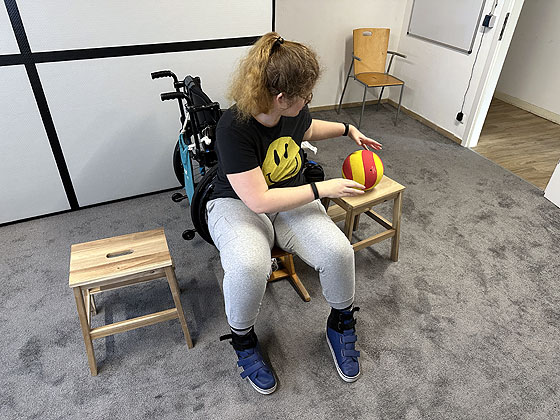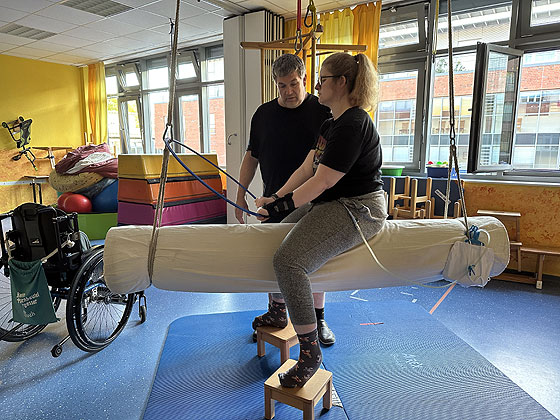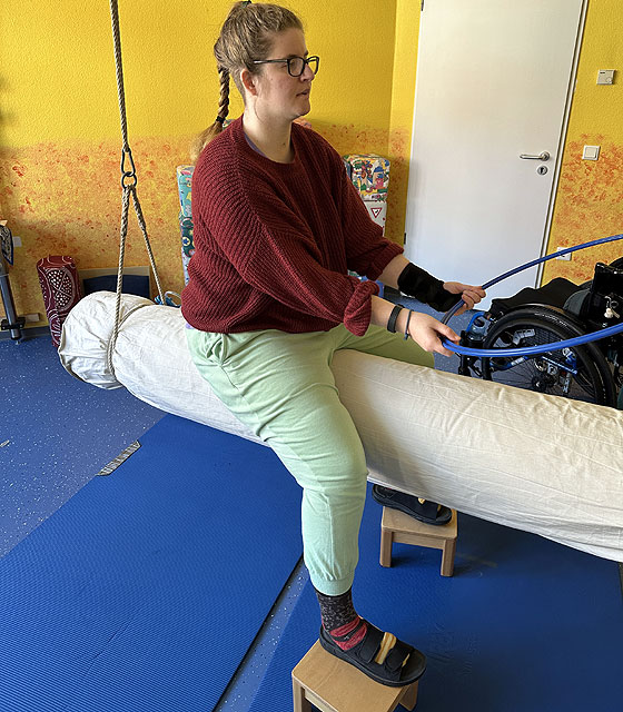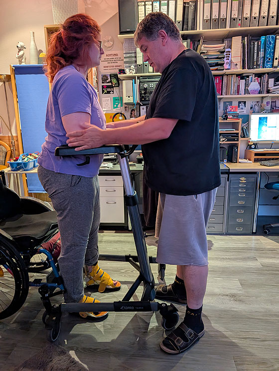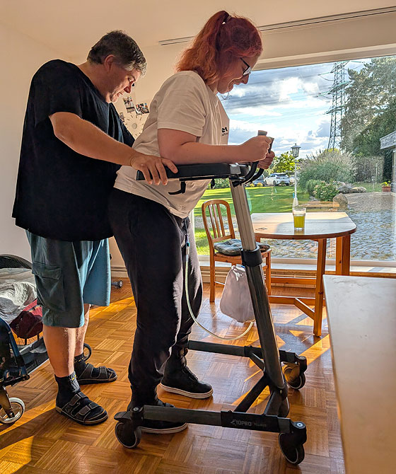 Auch beim Standing sind wir weiter drangeblieben und fördern immer mehr das selbstständige Aufstehen aus dem Rollstuhl – anfangs noch verstärkt mit Festhalten und Hochziehen: