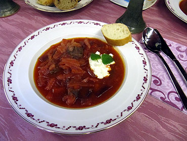geschnittene Rote Beete und Möhren in die kochende Brühe geben. Wenn