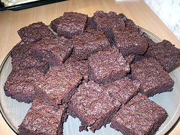 Kuchen in gleichmäßige Rechtecke schneiden und auf einer Platte servieren. |