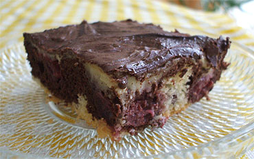 dunklen Teig auf dem hellen Teig ausbreiten. Die Kirschen in den Teig "drücken".