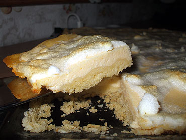 Backzeit aus dem Ofen nehmen und den Eischnee darauf verstreichen. Bei gleicher