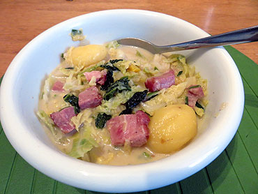 Brühe ablöschen. Kassler und Zwiebeln hinzufügen, 10-15 Minuten