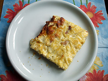mit Speck gleichmäßig verteilen und mit dem Sahne-Ei-Käse-Gemisch