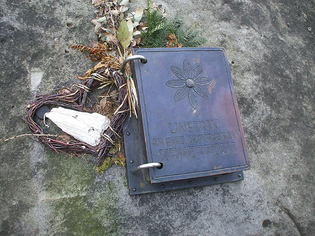 Ein bronzenes Bergbuch mit gravierten Seiten erinnert an gestorbene Kameraden