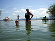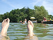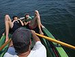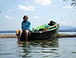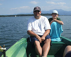 um- runden und Carsten hatte schon wieder die Ruder in der Hand. Der Kirchturm des Klosters war nahezu von jedem Punkt rund um die Insel sichtbar. Eine einsame Insel haben wir ebenfalls entdeckt. Dort saß passend zum Thema ein einsamer Mann, welcher im Gegensatz zu Robinson Crusoe nicht unter Palmen, sondern sich |