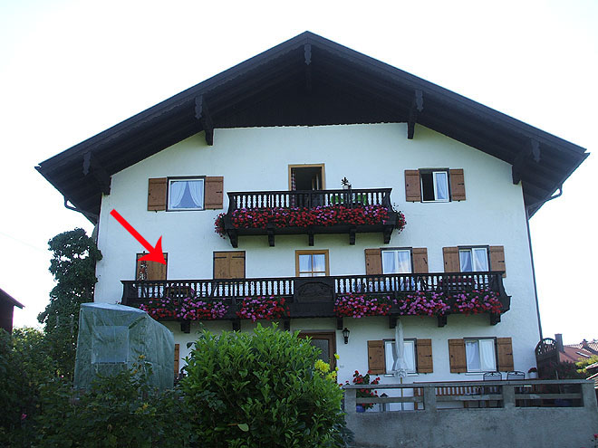 Unsere Ferienwohnung ... oder besser: das Haus von außen (Pfeil = "unser" Tisch)