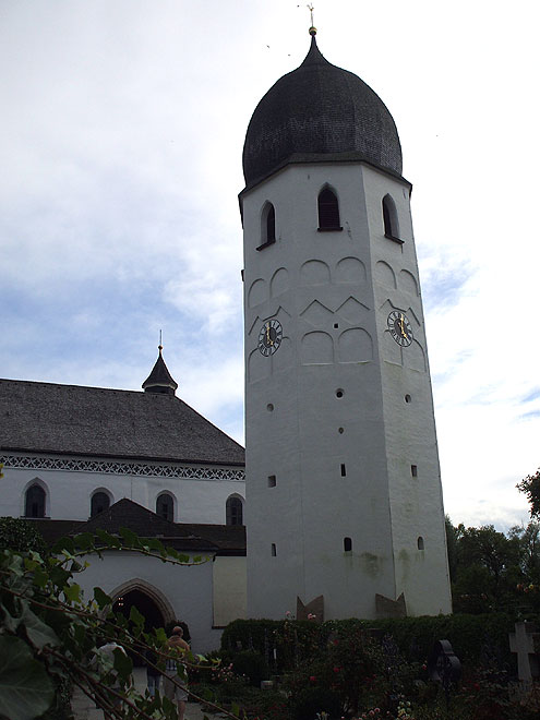 Der alles überragende Klosterturm der Fraueninsel aus der Nähe betrachtet