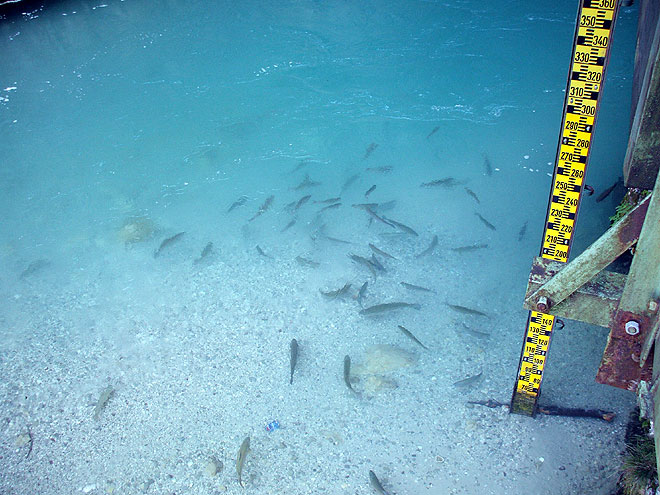Diese Ansammlung von Forellen läßt jedes Anglerherz höher schlagen (Tipp: Futterspender)