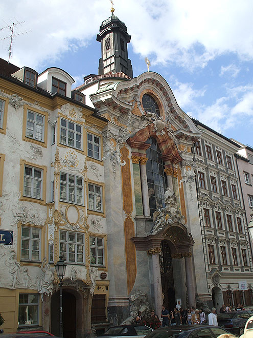 Von außen fast unscheinbar in die Häuserzeile integriert ... die Asam-Kirche