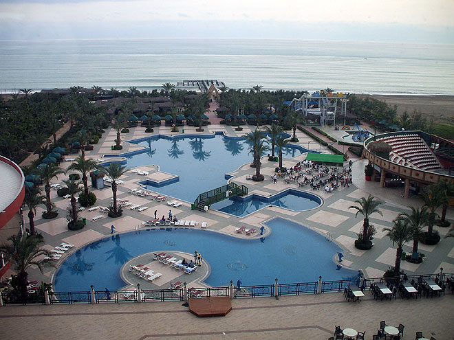 Der Poolbereich von oben und im Hintergrund der Hotelstrand mit eigenem Pier