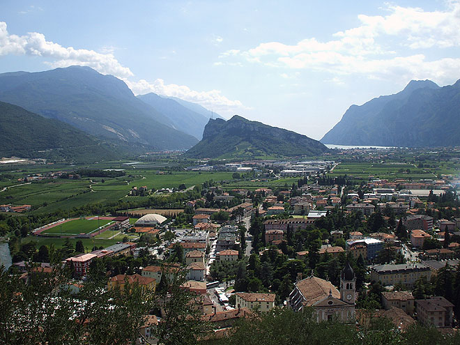 Blick über Arco bis zum Monte Brione, Torbole (links) und Riva (rechts)