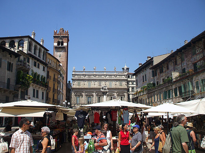 In der Mitte der Palazzo Maffei und links der mittelalterliche Uhrturm Torre del Gardello