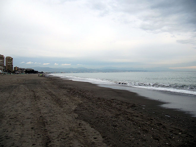 Links der Strand von Torremolinos und in der Bildmitte ist die Stadt Málaga zu sehen