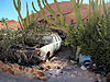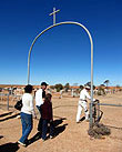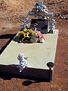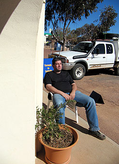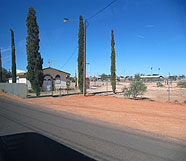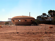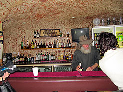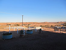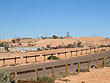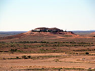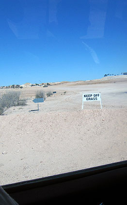 Coober Pedy mitten in der Wüste. Dass sich hier kein Grashalm dem Himmel entgegenreckt, liegt ja wohl auf der Hand, dennoch schmückt witzigerweise das Hinweisschild "Keep off grass" den Eingang zum Areal. Aber ansonsten fehlt es an nichts: die Driving Range zum Üben langer Schläge, die Abschlagzone mit Kunst- rasen, das Fairway aus platt gewalztem Sand und das Green bzw. die Puttfläche um das Loch herum - letzteres wird dunkel eingefärbt, um eine bessere Sichtbarkeit zu gewährleisten. Einzig einen Bunker sucht man hier vergebens, denn die Umgebung ist weiß Gott schon sandig genug. Wir erfahren auch, dass jeder |
