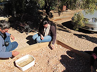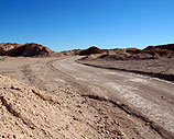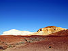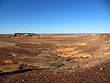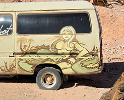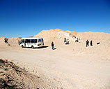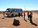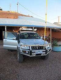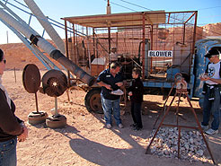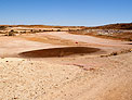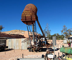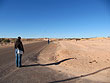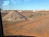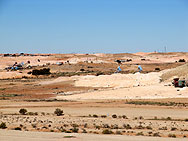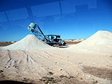 sollen wohl schon 490 Quadratkilometer durchgebuddelt sein und Schätzungen gehen von ca. 2 Mio. Löchern aus. Ein Claim hat normalerweise eine Kantenlänge von 50 mal 100 m. Bei der Suche fängt man zunächst mit einem kleinen Loch, dem soge- nannten "investigator drill" (= Recherchebohrung) an und wenn man zuversichtlich ist, wird das bereits vor- gestellte, schwere Gerät zum Einsatz gebracht. Dank eines eigenen Radeka-Claims können wir sogar alle einmal aussteigen und uns unter der Aufsicht unseres bärtigen Guides im Noodling versuchen. Beim Wühlen mit den Händen in einem Haufen Abraum entdecken wir allerdings nur kleinere Potch-Opale (es fehlt das faszinierende Farbspiel), mit denen man zwar kein Vermögen verdienen kann, die sich aber schön als An- denken mitnehmen lassen. | |