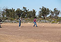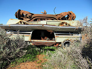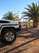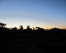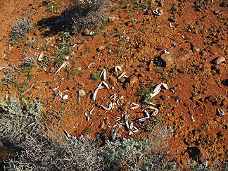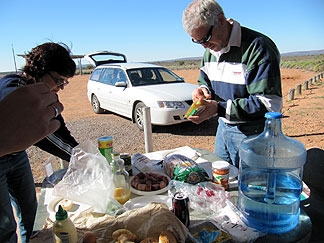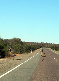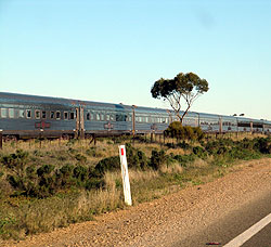 Parallel zur Straße verlaufen Eisenbahnschienen und wir sehen so- gar einen Zug darauf fahren. An sich bestimmt nichts Besonderes, aber als Carsten das Schild mit einem roten Kamel an der Seite der Waggons lesen kann, klärt er uns über die Bedeutung dieses berühmten Gefährts der Eisenbahngeschichte auf. Es ist der legen- däre The Ghan, welcher seinen Namen den afghanischen Kamel- führern verdankt, die lange Zeit vor der Motorisierung für die Trans- porte ins Landesinnere verantwortlich waren. Der Fernverkehrszug heißt offiziell The Afghanistan Express und mit fast 3000 Strecken- kilometern zählt er zu den längsten Eisenbahnlinien der Welt. Der Zug durchquert seit 2004 in einer fast 50 Stunden dauernden Fahrt den ganzen australischen Kontinent in Nord-Süd-Richtung und ver- bindet damit die Küstenstädte Adelaide und Darwin, immerhin eine Reise durch vier Klimazonen und über 22,5 Breitengrade hinweg. | ![]() |