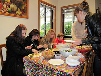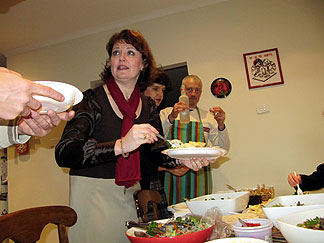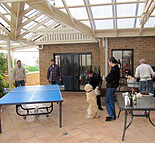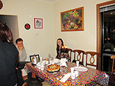 In der Zwischenzeit vergnügen sich die verbliebenen Gäste bei einem schön gekühlten Wodka und weiteren Gängen an das Buffet mit diversen Spielen. Das erste handelt von Fragen über Marinas Vergangenheit und ihrer Persön- lichkeit. Sie hat im Vorfeld einen Fragebogen vorbereitet und Eugene darf nun den Quizmaster spielen. Erstaunlicherweise gelingt es Olga sogar dieses Spiel zu gewinnen - Sascha ist natürlich von der Wertung ausgeschlossen - dabei hatten sie sich ja eigentlich zig Jahre schon nicht mehr gesehen. Für sie zahlte sich aber in diesem Moment die stundenlange Unterhaltung beim Ausflug nach Coober Pedy aus, denn durch die Gespräche wurde sie über Marinas Leben zwischen ihrem Besuch in Dresden im April 2006 und der jet- zigen Australienreise bestens informiert. Als Hauptgewinn bekommt sie eine Flasche australischen Weißwein aus Clare Valley und eine Goldmedaille mit Winner-Schriftzug. |