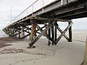an manchen Stellen gleichzeitig aus Holzplanken, Betonpfeilern und Metallträgern, |