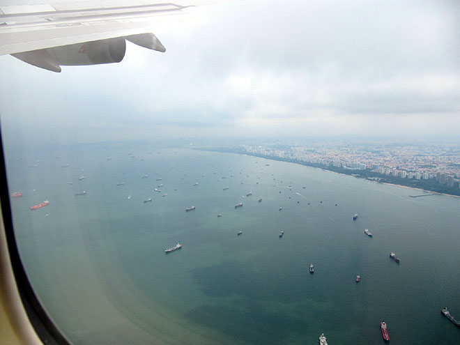 Das Wuseln der vielen Schiffe in der Bucht von Singapur sahen wir schon gestern bei Nacht