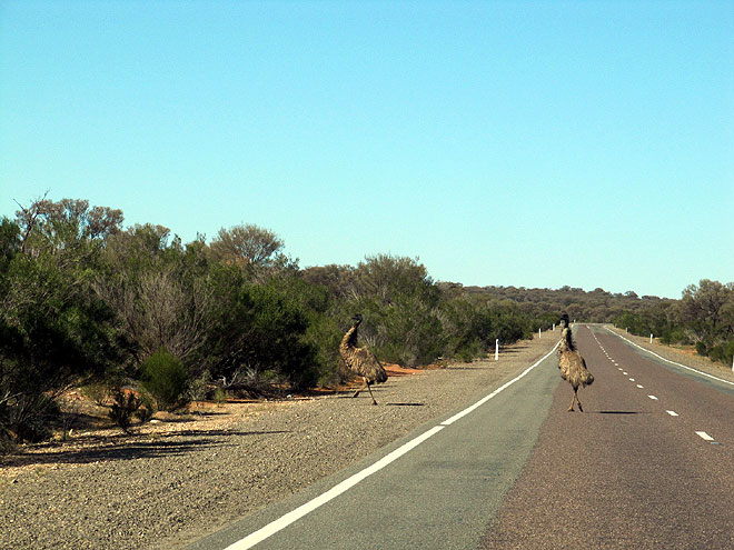... oder Tiere kreuzen die Straße, wie diese beiden Emus. Diesmal ist die Kamera zur Hand.
