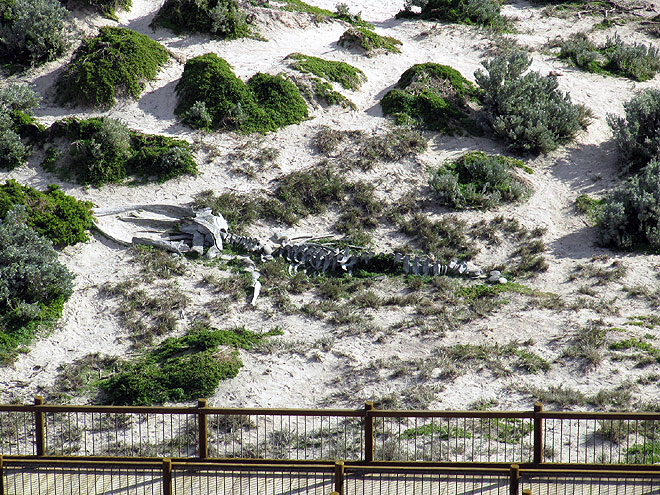 Während wir auf unsere Führung warten, entdecken wir dieses Walskelett in den Dünen
