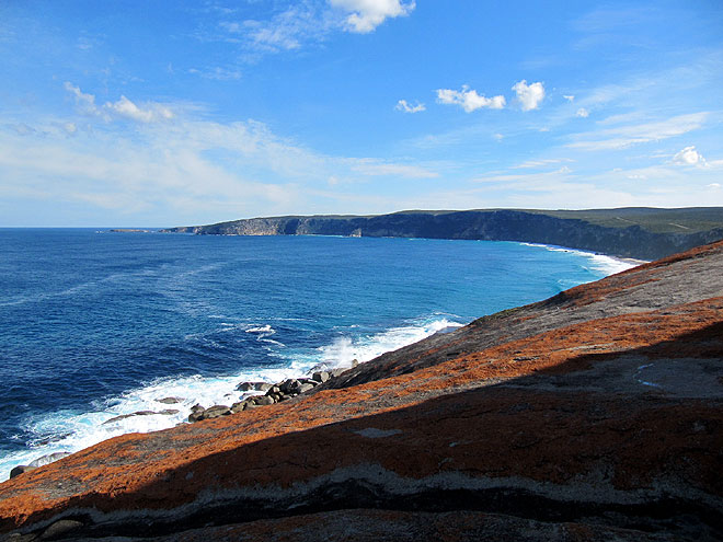 Erneut der Blick zurück zum Cape du Couedic (links) und Weirs Cove (mittig)
