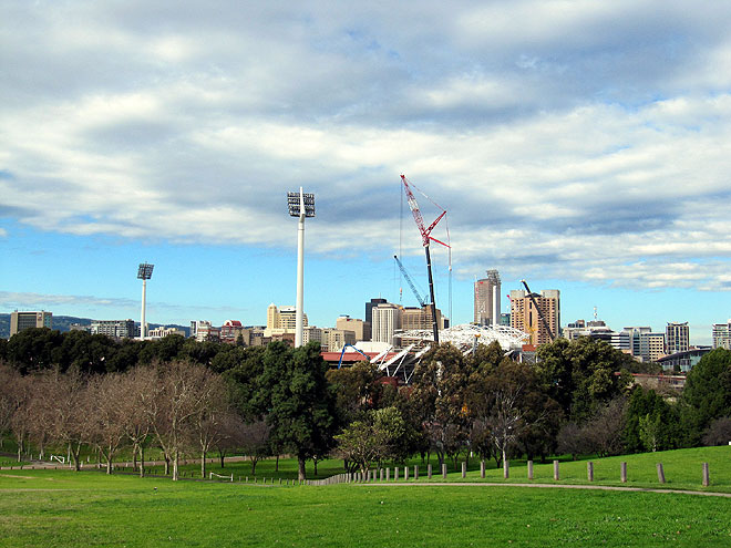 Vorne der grüne Parkgürtel, dahinter die Hochhäuser der Innenstadt