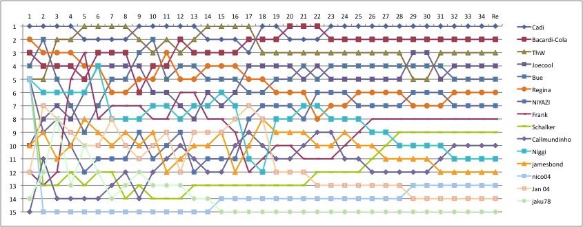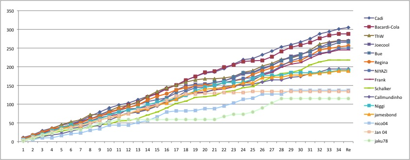 26. Juli 2009 20:53 Betreff: Cadi ist der Sommerjunge 2009 ;-) Herzlichen Glückwunsch! :) Dieses Jahr ist die Endauswertung ein wenig spät gekommen, aber man möge mir verzeihen, da in den letzten Wochen/Monaten meine Diplomarbeit das beherrschende Thema in meinem Leben war ! Ja, ich weiss, beschämend, wie konnte ich den Fussball nur so vernachlässigen ! ;) Aber vielleicht hilft ja die Ausrede, dass nun alles bestanden ist und ich endlich fertig bin ;) Eigentlich könnte der Abschlussbericht wie folgt lauten: An der Spitze nix Neues ! ;) Die üblichen Verdächtigen standen wie immer vorne, mit Cadi haben auch fast einen "Serienmeister" vorne ;) Und dieses Jahr hat auch keiner solch einen Erfolg verdient wie er, hat der östlichste Tipper von uns allen am Meisten an der Tabellenspitze gestanden Mit Thorsten und Lars hatten wir zwischenzeitlich andere Spitzenreiter, die sich aber nicht lange halten konnten. Alles weitere an Platzierungen könnt ihr aus der Grafik entnehmen ! Mit der zweiten Grafik kann besonders gut erkennen, wer erstmal fleissig mitgetippt hat (gell, Jan ? ;) ) und wie sehr sich Lars und Cadi in der zweiten Saisonhälfte von den anderen absetzen konnten. Am Ende war Cadis Vorsprung aber doch nicht mehr in Gefahr, spannender waren die Plätze 3-5, dort haben ähnlich wie in der Bundesliga Thorsten und Walid sich ganz knapp vor Bü gehalten (das bedeutet Regeländerungen Freunde !! ;) ). Walid hat nach seinem Bombenjahr immer noch einen passablen 4. Platz geliefert. Damit bleibt auch wie im letzten Jahr für Bü ein undankbarer UEFA-Cup-Platz, das wars mit meinen Champions-League-Millionen ;) Erwähnenswert sind noch folgende Aspekte: -