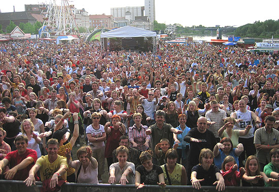 Oooooooch menno ... ... es ist ja schon wieder Mittwoch und ich komme jetzt mit einer ollen Kamelle daher. Aber ich schreib es trotzdem, denn die elektronische Erinnerung prangt schon seit Montagmorgen am Monitor - so ! Hallo Weltfamilie ! Auf der Arbeit wird es nun recht ungemütlich für mich: ich muß tatsächlich mal was tun ! Und da bleibt dann viel weniger Zeit für die kleinen privaten Dinge zwischendurch ;o) andererseits arbeite ich derzeit z.T. hauptverantwortlich am Herz des UKD - an der zentralen Telefonanlage des Klinikums. Aber das wollte ich eigentlich garnicht lang und breit erzählen. Unser (kinderfreies) Wochenende dürfte wohl viel interessanter sein, denn wir haben den Freitag und Sonntag auf der "JUMP City Riesa" verbracht. Ein Radiosender des MDR (JUMP) hat für 3 Tage die kleine Stadt Riesa, ca. 80 km elbabwärts von Dresden, in eine Festivalstadt verwandelt ... und das für nur 10 Euro Eintritt. Wir also hin ! Am Freitagabend sind wir nach der Arbeit mit offenem Töff-Töff zur Erdgasarena gefahren, wo um 21 Uhr eine Show mit einer Musiktruppe und zwei Komikern stattfand. Es hat sich doch gelohnt ab 19 Uhr vor dem Einlaß zu warten, denn wir haben direkt an einem Tisch an der Bühne gesessen - am Ende war die Halle mit ca. 10000 Leuten rappelvoll. Den musikalischen Auftakt und das Pausenprogramm gestalteten eine Rock'n'Roll-Combo namens "Boppin' B", die sich selbst als "Scheißkapelle" bezeichnet. Das mußten wir auch alle brüllen, wenn von der Band die Frage "Are you allright ?" kam ... war ganz witzig. Den ersten Comedian fanden wir schon vorher nicht besonders gut und auch auf der Bühne hat er uns nicht so ganz überzeugt: Hans Werner Olm. Alleine seine letzten 10 Minuten Luise Koschinski haben etwas lachmäßig aufgewärmt. Und dann kam 1 Stunde Comedy vom Feinsten, auf die wir uns so sehr gefreut haben: Kaya Yanar brachte die Halle zum Beben und uns zum Quieken. Er ist einfach Klasse und live sogar fast noch besser als im TV. Wir fielen um Mitternacht totmüde und mit einem breiten Grinsen ins Bett. Auch am Sonntag wollten wir auf der Bühne am Elbufer eigentlich nur die letzte Truppe sehen, doch das Rahmenprogramm hat ebenfalls überzeugt. Wir waren schon um 15 Uhr in Riesa und schlenderten ein bißchen herum, doch ab 17 Uhr standen wir fast direkt vor der Open-Air-Bühne nur noch auf einem Fleck ... bis 23 Uhr !!! So schwer waren meine Füße noch nie und die Waden haben am nächsten Tag auf Arbeit noch Krämpfe gehabt. Aber wie gesagt, auch hier hat es sich gelohnt, denn 30 Minuten Hochseilakrobatik der Familie/Geschwister Weisheit in 20 bzw. 40 Metern Höhe und eine fantastische Performance der Leipzig-Truppe "Firebirds" heizten schon mächtig ein. Zuerst dachten wir beide, daß die "Firebirds", eine Musiktruppe der 50er & 60er Mucke, für uns bestimmt sehr langweilig werden würden, aber wir wollten auf keinen Fall die Spitzenplätze vor der Bühne abgeben. Doch obwohl wir beide keine großen Fans von Rock'n'Roll sind, haben wir ordentlich bei all den Klassikern mitgerockt. Hier der Beweis (von der Firebirds-Webseite) - Na, habt ihr uns gefunden ? Für die Auflösung mit der Maus auf das Bild zeigen. Jedenfalls waren wir völlig aufgepusht und dann kam die Gruppe, auf die wir seit Tagen gewartet haben - BossHoss traten auf ! Und die haben 90 Minuten "Trashcountry-Punkrock" der besten Güte gegeben. Wikipedia schreibt: >> The BossHoss ist eine 7-köpfige Berliner Musikgruppe, die Lieder von Interpreten und Musikgruppen aller Genres (Britney Spears, Beastie Boys, OutKast, The White Stripes u. a.) im Country-Stil interpretiert. Die Gruppe bedient die typischen Cowboy-Klischees mit Cowboyhut, Feinrippunterhemden und Siegelringen, sowie Whiskeyflaschen und Yeehaw-Schreien. Ihren Musikstil bezeichnen sie selbst als Trashcountry Punkrock. << Die gaben uns und unseren Beinen den Rest ! Ich weiß nicht wie BOSS das bei seinem Rumgezappel auf der Bühne - der Barhocker auf dem er saß-stand-saß-sprang-saß-umwarf-drehte-saß-wippte-uvm. war mehrfach getaped und verstärkt - aushält, aber die Menge tobte bei jedem Lied mit *** YEEHAW !!! *** Wir lagen nach einem tollen Abschlußfeuerwerk und der Heimfahrt im offenen SMART (im Player spielte lautstark eine BossHoss-CD !) um ca. 1 Uhr mit der Gewißheit im Bett, daß am nächsten Morgen der Wecker wieder um 6 Uhr bimmeln würde. Diverse Songfragmente hatten Olga und ich immer wieder während der Arbeit im Ohr und vielleicht ist mir auch manchmal ein "Yeehaw" auf dem Flur entwichen ... ;o))) So, das sei noch zu so später Stunde von unserem tollen und unvergeßlichen Wochenende berichtet - jetzt hat uns der Alltag schon wieder fest in der Hand, doch mit einem "Yeehaw" sieht alles schon wieder viel bunter aus :o) Ich