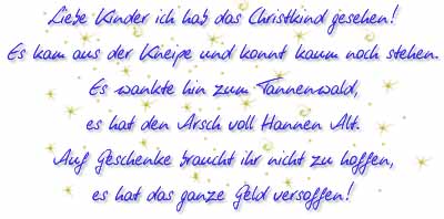 Jeden Dezember das gleiche Theater: Weihnachten steht vor der Tür ! Ja meine Güte, warum läßt man es nicht einfach mal stehen, tut so, als wär nix gewesen ? Sonst lässt man doch auch nicht jeden Arsch rein. Die Zeugen Jehovas, der GEZ-Mann - da macht man erst gar nicht auf, strullt aus dem Schlafzimmerfenster oder ruft die Polizei. Aber kaum klopft der runkelnasige Fettsack von Weihnachtsmann mit seiner Elch-Sackkarre an die Pforte, machen wir einfach jeden Scheiß mit ! Lichterketten um die Klobrille, Tannenzapfen in die Unterhose, Zimt in den Doppelkorn - sind wir denn bescheuert ? Wir fressen Mini-Schokolade in Fliegenpilzförmchen aus häßlichen überteuerten Adventskalendern, anstatt uns eine anständige Tafel in den Hals zu schieben. Wir schmücken zum Advent vertrocknete Beerdigungskränze und zünden andächtig jede Woche ein Kerzelein an, obwohl wir auch einfach das Licht anschalten könnten. Wir saufen ausgekochte Restrotweinplörre mit Zucker und Miracoli-Gewürzmischung, bis uns die Rübe platzt, wo wir uns doch bloß ein Täßchen Brennspiritus mit Süßstoff warm machen und den Kopf in einen Betonmischer halten müssten. Das macht nicht wirklich Sinn. Andererseits ist es aber auch einfach schön romantisch, und besser man kotzt Domino- als Gallensteine. Trotzdem kann einem diese ganze Vorweihnachtszeit ganz schön auf die Nüsse gehen. Wenn täglich eine Horde Backfische in der Fußgängerzone schreckliche Liederchen trällert, alle Knuddelzombies aus ihren Altenheimen steigen und die Schmalzfluten vorgetäuschter Herzlichkeit über die Ufer treten, dann weiß man, daß Weihnachten naht. Eine Zeit, in der man nach dem Unterhalten das Gefühl hat, dringend duschen zu müssen. Dann wird wieder gegrinst und gemenschelt, bis dem Zuhörer die falsche Sentimentalsuppe aus den Ohren quaddelt. Plötzlich erinnern wir uns alle daran, daß man anderen ja auch helfen kann, anstatt sie zu bescheißen oder einfach zu ignorieren. Aber zum Glück vergessen wir das auch schnell wieder. Denn auch wenn mal kurzzeitig das Christkindl über unsere Köpfe flattert und für ein paar Tage unsere Fürze nach Nelken riechen - im Herzen bleiben wir ja doch alle die gleichen Idioten wie immer. So was nennt man Beständigkeit.