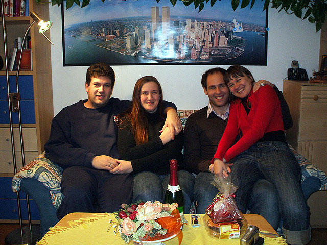 03.03.2007 | Mit frisch gebrautem Baileys und einem selbstgebackenen Cappuccino-Kuchen entern Olga und Carsten die CS/HC-Party in Dresden-Friedrichstadt. Hier treffen wirklich alle Sorten von Menschen aufeinander: eine Rumänin ohne Scheu vor dem Ansprechen, eine nette Bulgarin mit Interesse an den OLCA-Heiratsfotos, vier lebenslustige Jugendliche aus Carstens alter Heimat, eine Litauerin samt Haareschneideausrüstung (auf einer Party !!!), zwei mutige Haarschneideopfer und viele kontaktfreudige Dresdner inklusive ihrer derzeitigen Couch-Nutzer ... einfach ein kunterbunter Haufen, den man in Dresden eigentlich nur in der Neustadt erwartet. |