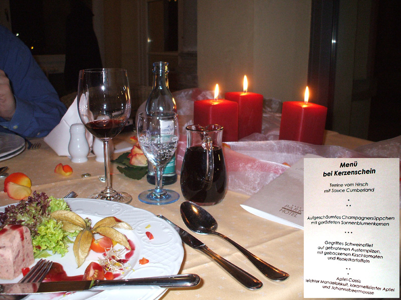 14.02.2008 | Gemeinsam haben sich Olga und Carsten für ihren 2. Hochzeitstag etwas zum totalen Relaxen ausgesucht: nachdem beide von 11 Uhr bis 18 Uhr in der Toskana Therme die Ruhe und Entspannung des Wassers genießen konnten (Liquid Sound-Becken, Saunalandschaft, Whirlpool und Massagedüsen) wird der kulinarische Teil am Abend als 4-Gänge-Candle-Light-Dinner im Park Hotel eingenommen. >>_Foto_<< |