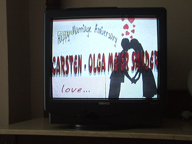 14.02.2009 | Wie im letzten Jahr bleibt am Hochzeittag die meiste Zeit einem Verwöhnprogramm und der Zweisamkeit vorbehalten. Nach Hamam, Sauna, Schokoladen-Gesichtsmaske, Massage und Yakuzzi-zu-zweit lockt die Gemütlichkeit der Sofa-Sitzgruppen in der Hotelbar zum Lesen, Internetten und Emailschreiben, bevor am Abend das Candle-Light-Dinner ansteht. Zu allem Glück belegen Olga und Carsten sogar noch den 1. Platz bei der Animationsveranstaltung "Bestes Valentinstagspärchen des Hotels" ... siehe Türkei-Bericht. >>_Foto_<< |