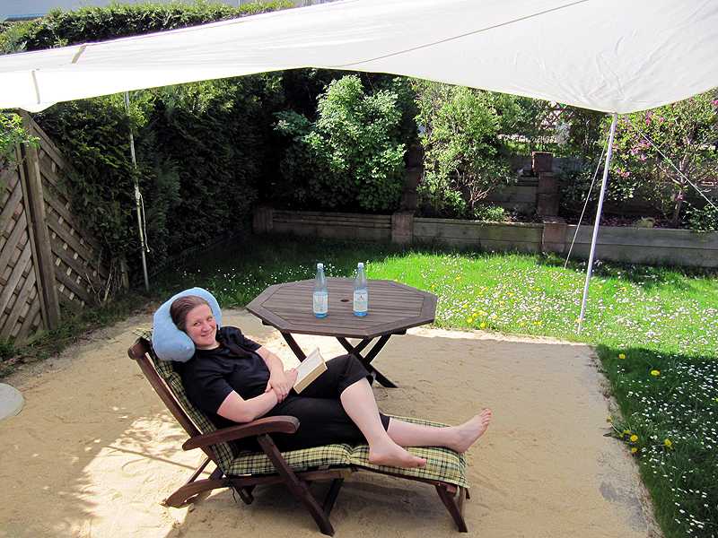 24.04.2011 | Die Premieren nehmen in diesem Monat einfach kein Ende, denn nach Grillen und Cabriofahren wird heute zum ersten mal in diesem Jahr das Sonnensegel auf der Terrasse aufgebaut. Olga verbringt darunter fast den ganzen Tag mit einem Buch in der Hand (siehe Beweisfoto). |