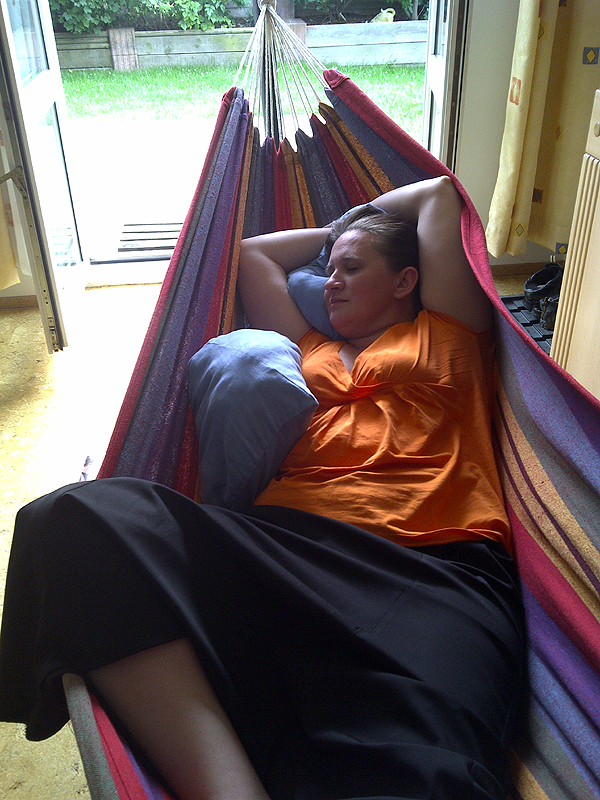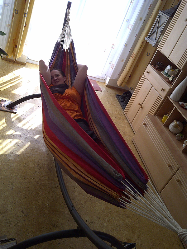 19.07.2011 | Ein weiterer großer Wunsch von Olga geht nach Jahren des Bitten und Bettelns endlich in Erfüllung: sie bekommt ihre eigene Hängematte. Durch das zerlegbare Gestell kann sie nun ab sofort im Haus, auf der Terrasse oder im Garten nach Lust und Laune abhängen und lesen, schlafen oder einfach nur die Seele baumeln lassen. >>_Beweisfoto_1_<< & >>_Beweisfoto_2_<< |
