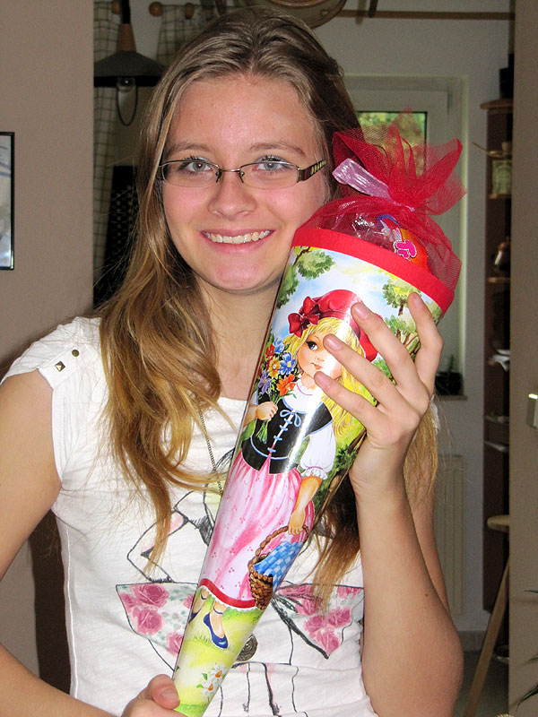 04.10.2011 | Andrea bekommt zu ihrem ersten Studientag eine Miniaturversion ihrer damaligen Schuleinführungszuckertüte überreicht. Ihre große Nervosität vor der neuen Umgebung, den vielen neuen Leuten und der völlig unbekannten Lehrweise nimmt diese aber leider auch nicht ... >>_Beweisfoto_<< |