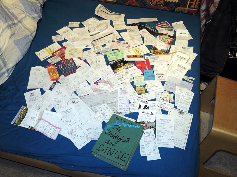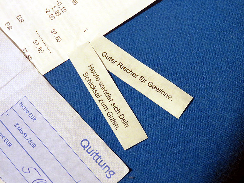 11.01.2015 | Seit 2013 sammelt Olga Erinnerungsstücke des laufenden Jahres in der Kiste "Die Wichtigkeit kleiner Dinge", die dann immer mit großer Spannung im Januar durchgesehen wird. Dieses Mal zeugen die ausgebreiteten Papierschnipsel von etlichen Igel-Touren, ein paar Abenden im "Odessa", den ersten Fahrten mit den Dresdner Verkehrsbetrieben, der tollen NRW-Woche, vom Hausverkauf, dem Umzug, dem Renovieren und verhältnismäßig vielen Theaterbesuchen. Besonders passend sind allerdings die Sprüche gewesen, die Olga und Carsten am Abend der Kaufvertragsunterzeichnung in ihren Glückskeksen vorfanden: "Guter Riecher für Gewinne" und "Heute wendet dich Dein Schicksal zum Guten". >>_Beweisfoto_1_<< & >>_Beweisfoto_2_<< & >>_Beweisfoto_3_<< |