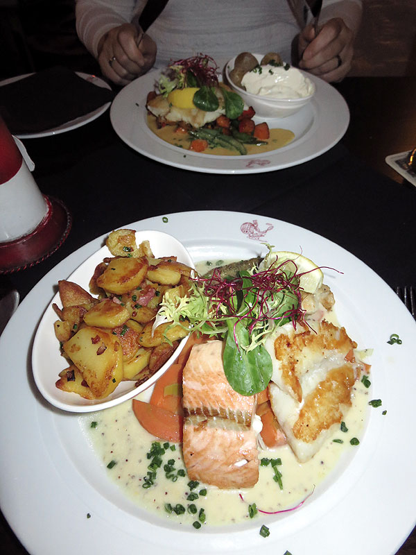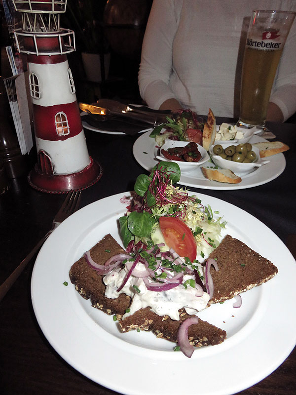 25.10.2015 | OLCAsche Heißhungerattacken in der Woche führen dazu, daß die Küche an diesem Wochenende kalt bleibt. Am Samstag werden Carstens Gelüste nach einer Thunfischpizza mit Zwiebeln gestillt, nachdem sie von dem Elbespaziergang mit Anna und Hund beim Haus&Hof-Dönermann vorbeigehen und am heutigen Sonntag geht Olgas großer Wunsch nach Fisch in Erfüllung. Ihren ersten Besuch im Fischrestaurant "Schwindts" bereuen sie keinesfalls, aber mal sehen, was morgen früh die Waage nach dem Gelage mit Vorspeise (Sassnitzer Matjeshappen mit würziger Remoulade und Zwiebelringen auf Schwarzbrot & Marinierter Hirtenkäse, Oliven und getrocknete Tomaten), Hauptspeise (Fischplatte mit Filets vom Zander, Dorsch und Wildlachs an Dijon-Senf Sauce & Gebratenes Heilbuttfilet an Sanddorn-Senf Sauce) und Nachspeise (Sturmsäcke Arkona mit warmen Schattenmorellen, Vanilleeis und Schlagsahne & Kreidefelsen mit Waldbeeren, Schokoladeneis, Baileys und Schlagsahne) zu vermelden hat. |